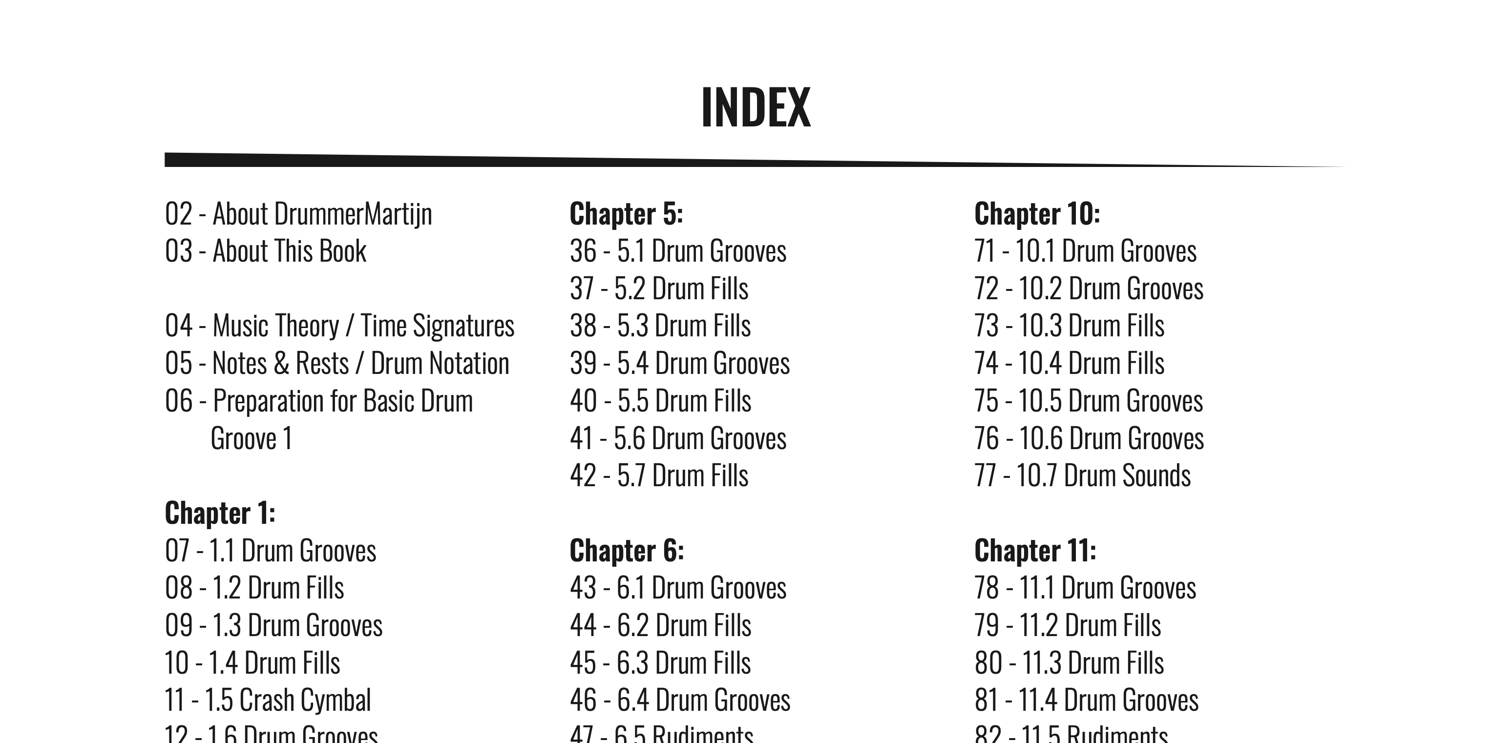 The complete table of contents (index) of drum method book Drummers of The Future – Beginner by DrummerMartijn