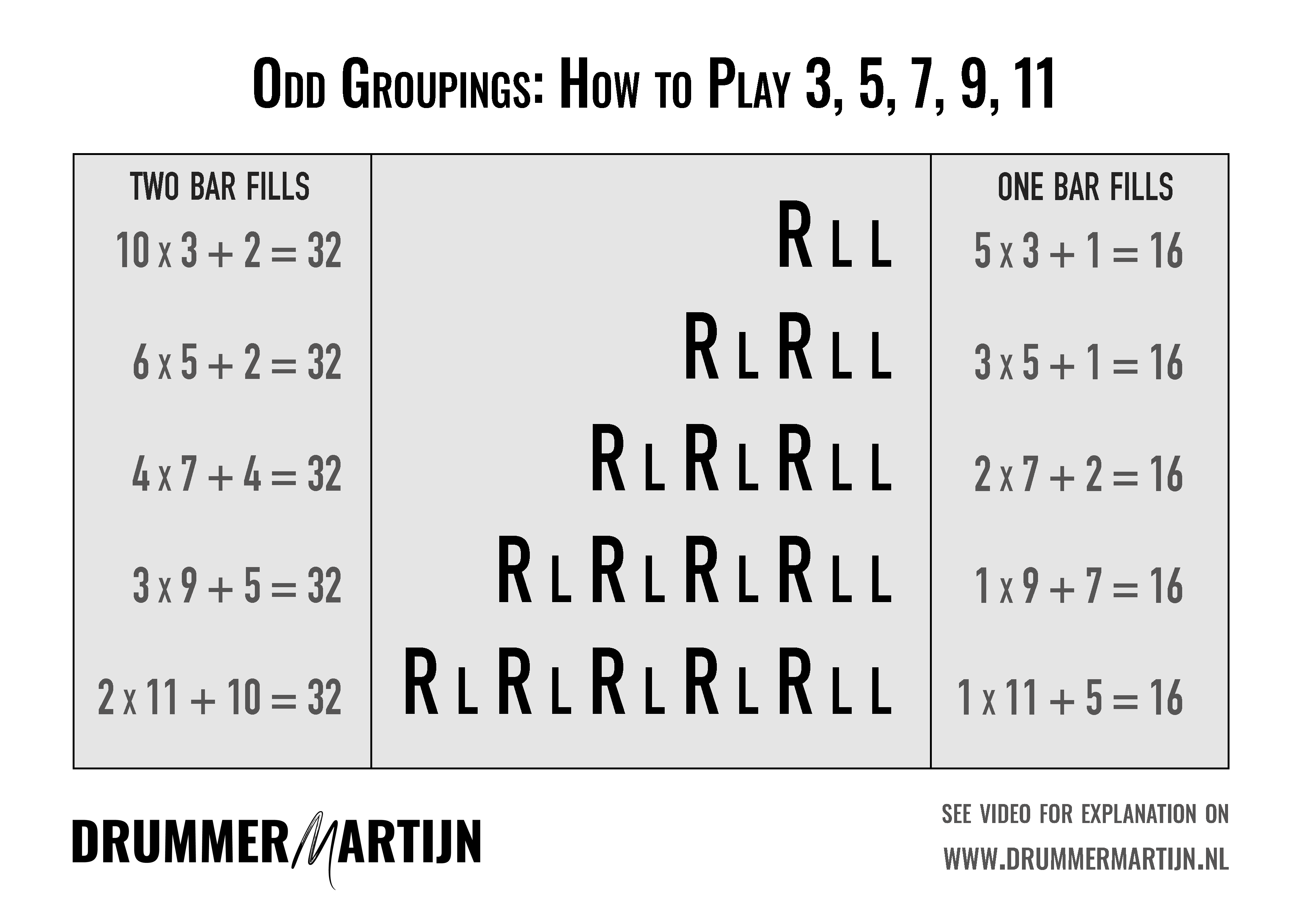 Free download of the Odd groupings System Overview (PDF) as seen in video lesson “Odd Groupings: How to Play 3, 5, 7, 9 & 11 // Drum Lesson w/ DrummerMartijn”